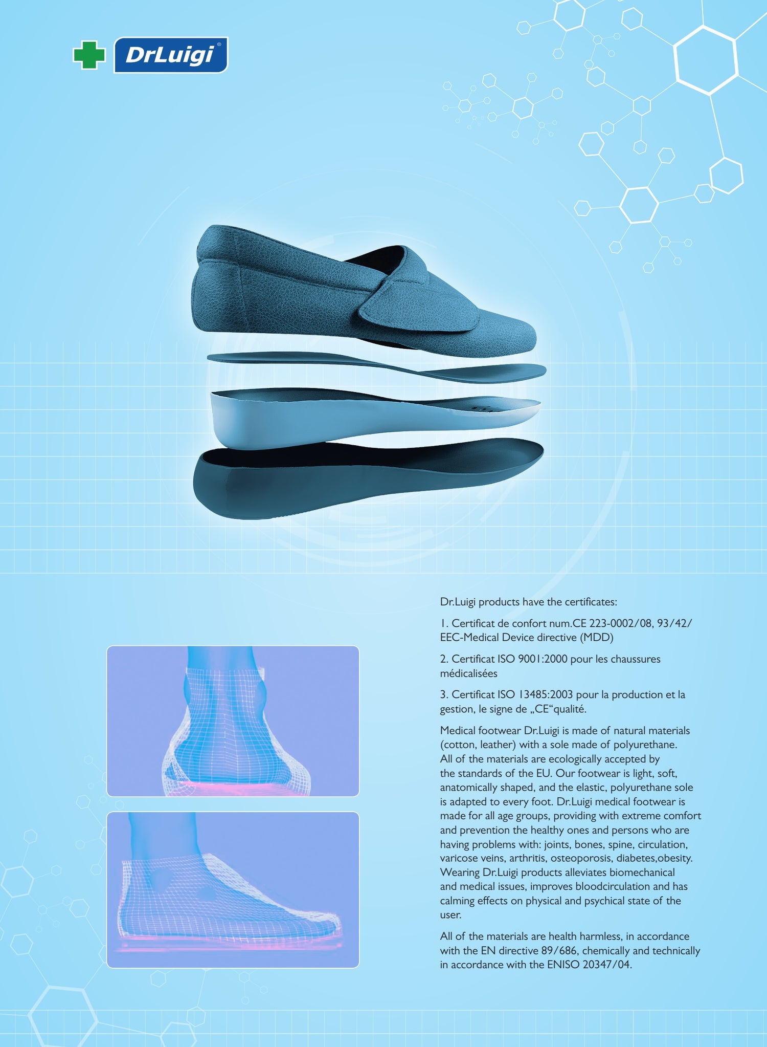 With our special design techniques we created ultra-light comfortable medical footwear (1 pair weighs only 0.2kg) suitable for indoor and outdoor. Our footwear is produced almost entirely out of completely natural materials such as cotton and leather. The production is set in accordance with the most rigorous ecological standards mandated by the European Union and thus our company has obtained the highest certificates for quality, management and design.